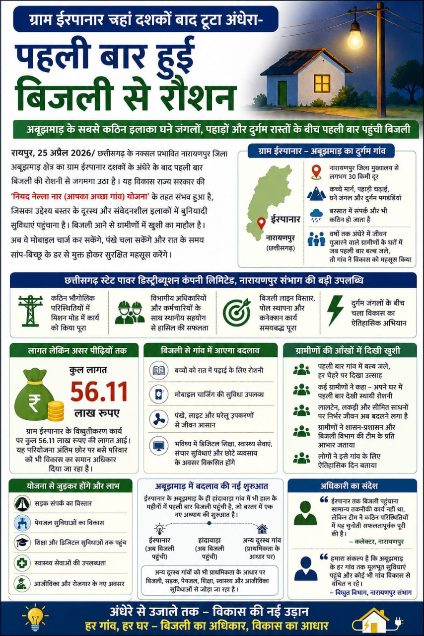 तक बिजली पहुँचने से अंधकार और भय कम हुआ है, जीवन स्तर में सुधार आया है और विकास को नई गति मिली है, जो बस्तर के सुरक्षित और समृद्ध भविष्य की ओर संकेत करता है। छत्तीसगढ़ के नक्सल प्रभावित नारायणपुर जिला का अबूझमाड़ क्षेत्र का ग्राम ईरपानार दशकों के अंधेरे के बाद पहली बार बिजली की रौशनी से जगमगा उठा है। यह विकास राज्य सरकार की नियद नेल्ला नार (आपका अच्छा गांव) योजना के तहत संभव हुआ है, जिसका उद्देश्य बस्तर के दूरस्थ और संवेदनशील इलाकों में बुनियादी सुविधाएं पहुंचाना है। बिजली आने से ग्रामीणों में खुशी का माहौल है। अब वे मोबाइल चार्ज कर सकेंगे, पंखे चला सकेंगे और रात के समय सांप-बिच्छू के डर से मुक्त होकर सुरक्षित महसूस करेंगे।